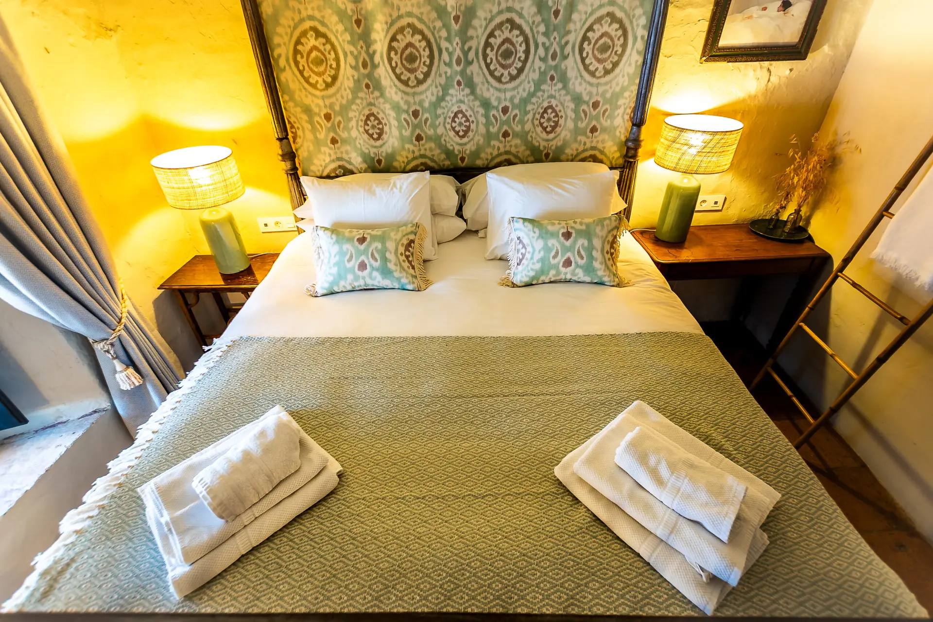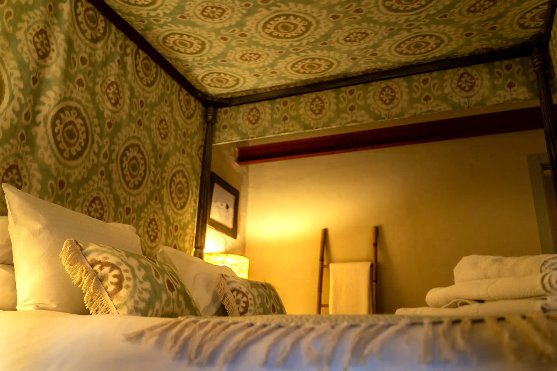 The bedroom features a four-poster bed and views onto the street, while the private terrace overlooks the garden and plunge pool — a perfect spot to relax at any time of day.